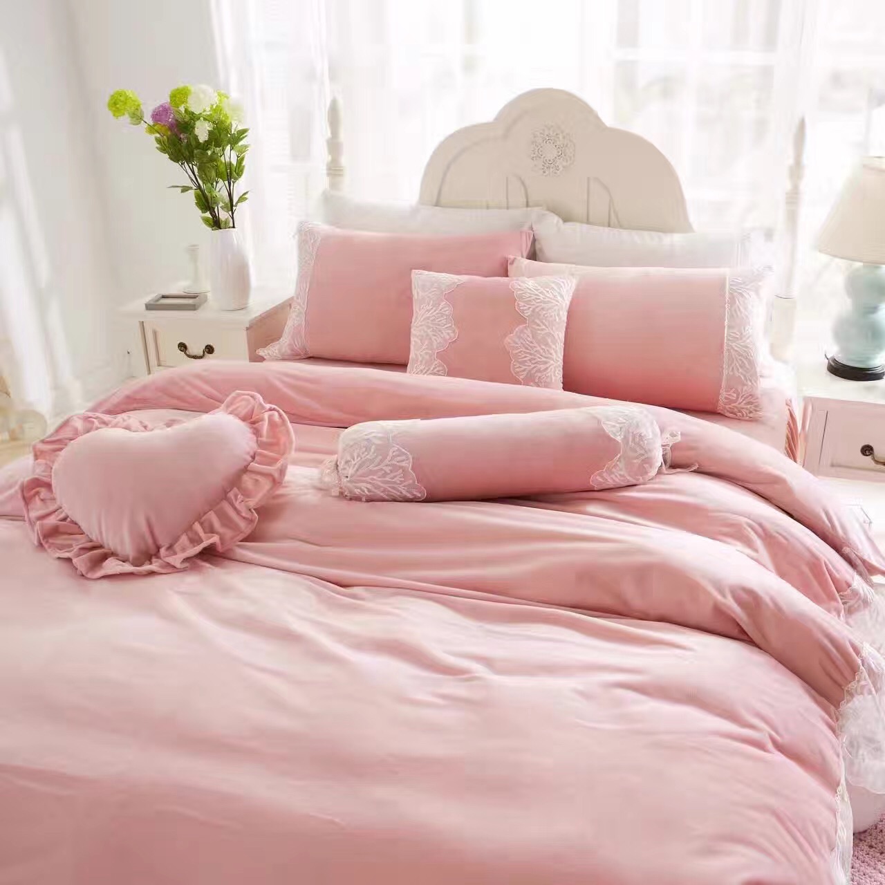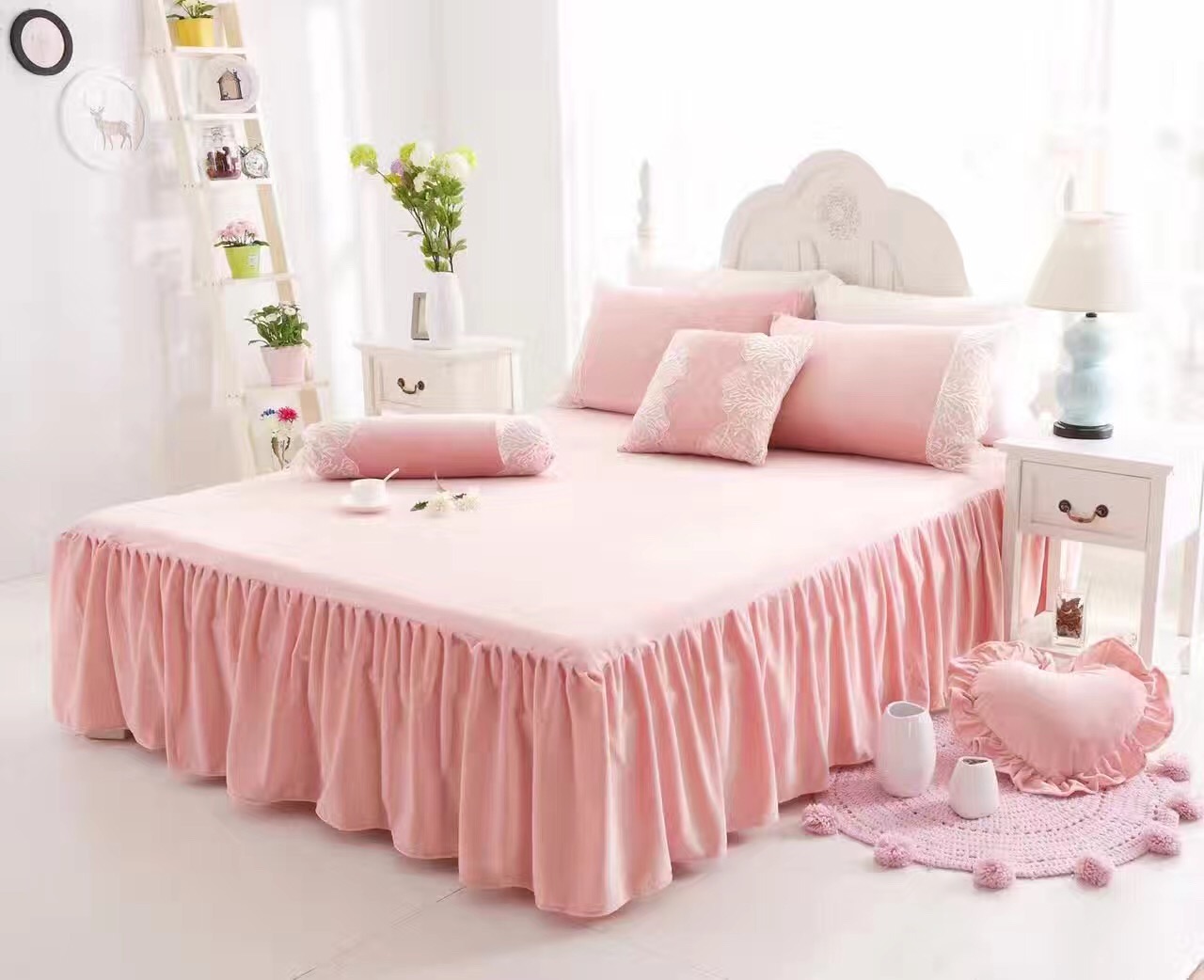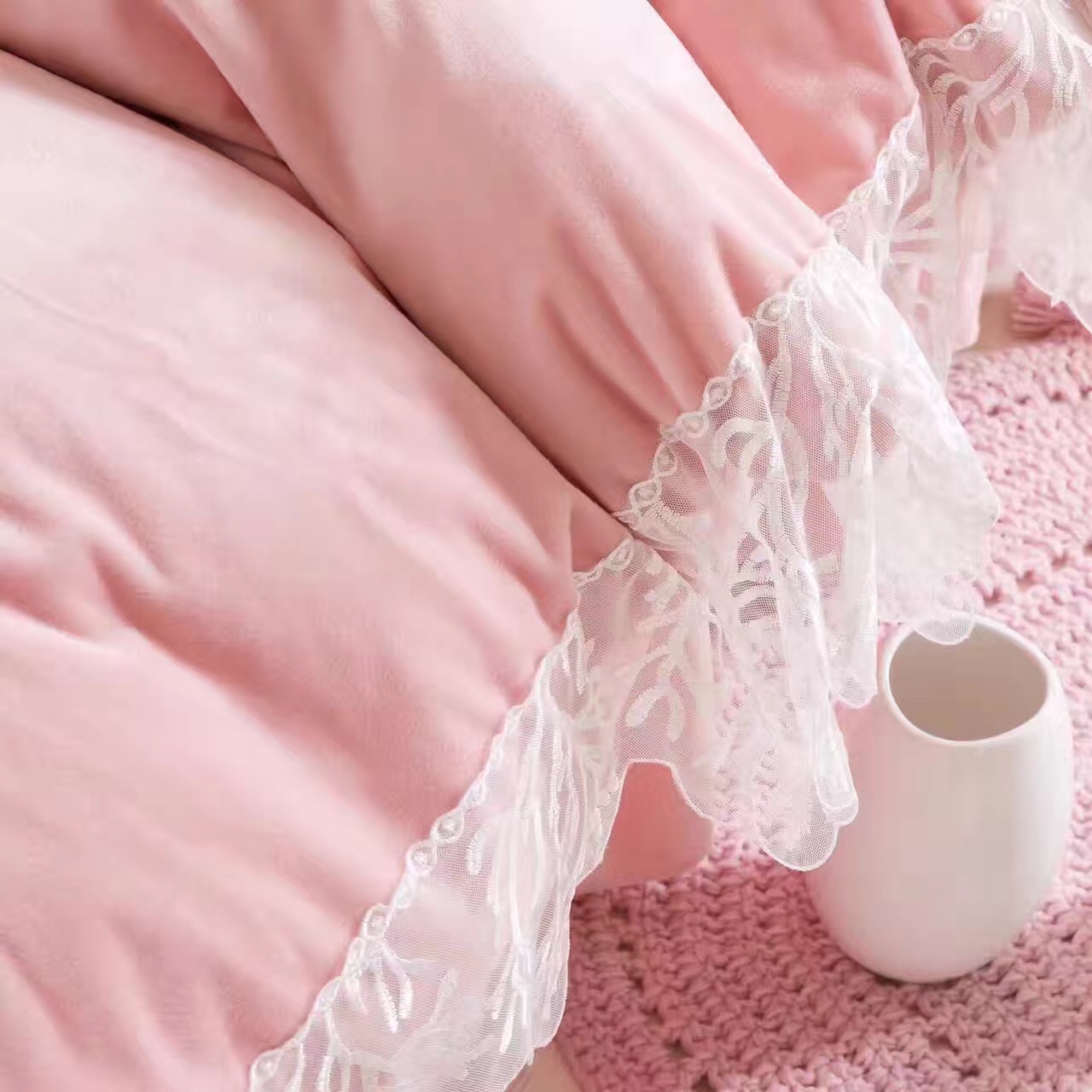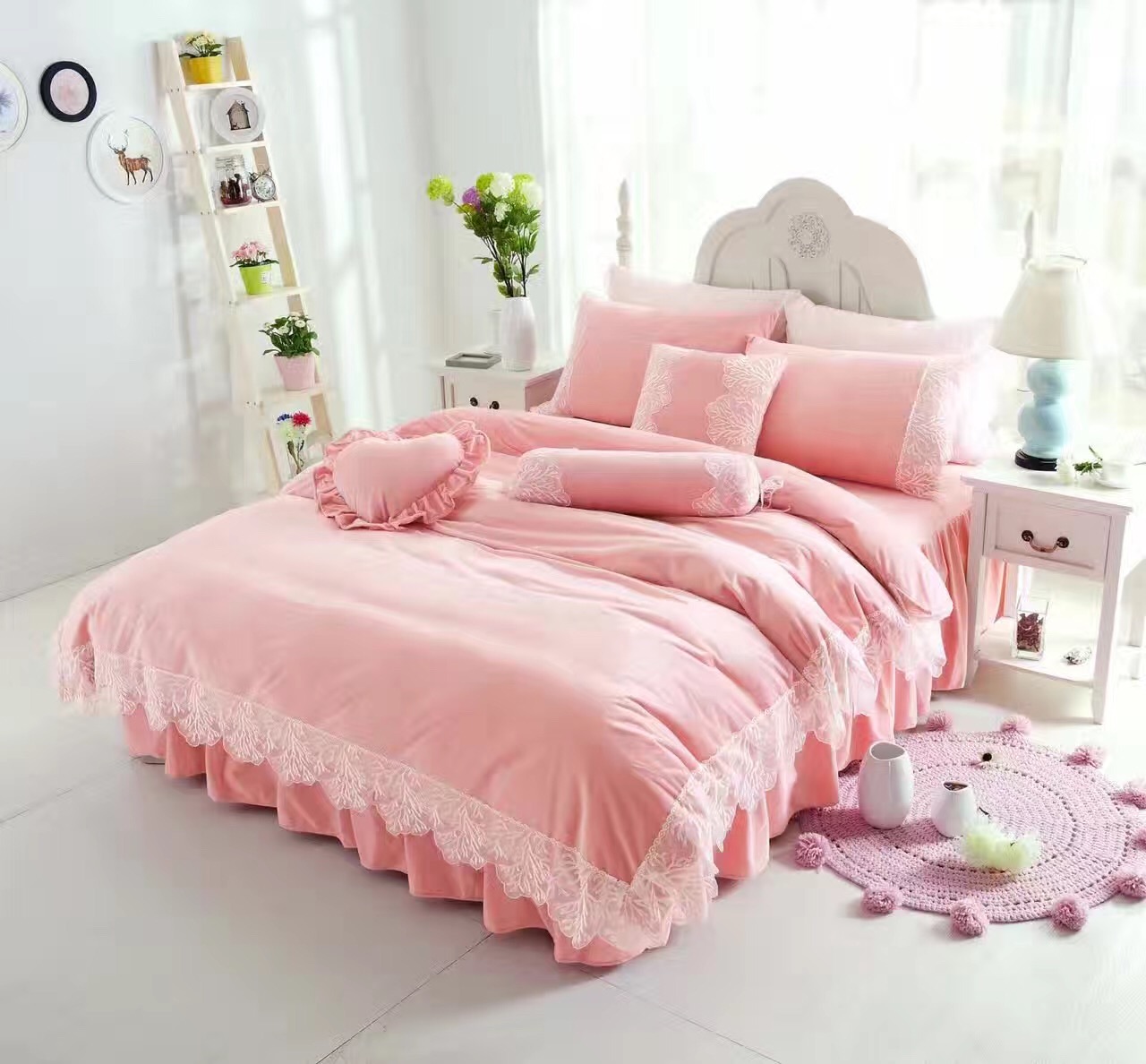 輔料:進口蕾絲 規格:1.5床 被套200*230 ,床裙150*200+45《高》,枕套48*74 ............................................. 1.8床 被套200*230,床裙180*200+45《高》,枕套48*74 ............................................. 1.8被加大 被套220*240,床裙180*200+45《高》,枕套48*74 .......................................... 2.0床 被套220*240,床裙200*220+45《高》,枕套48*74